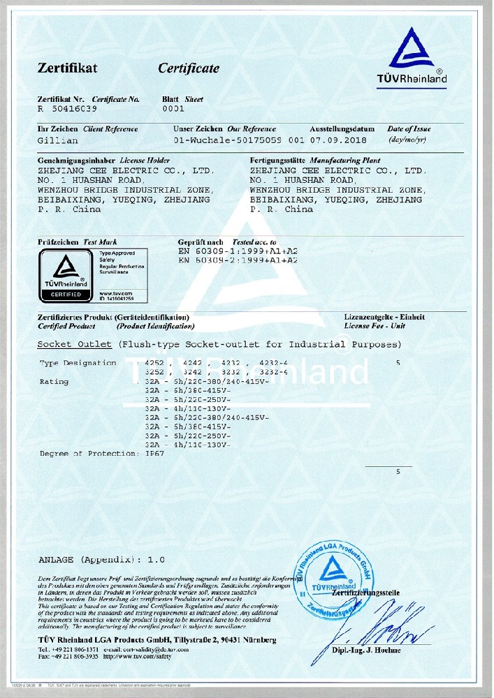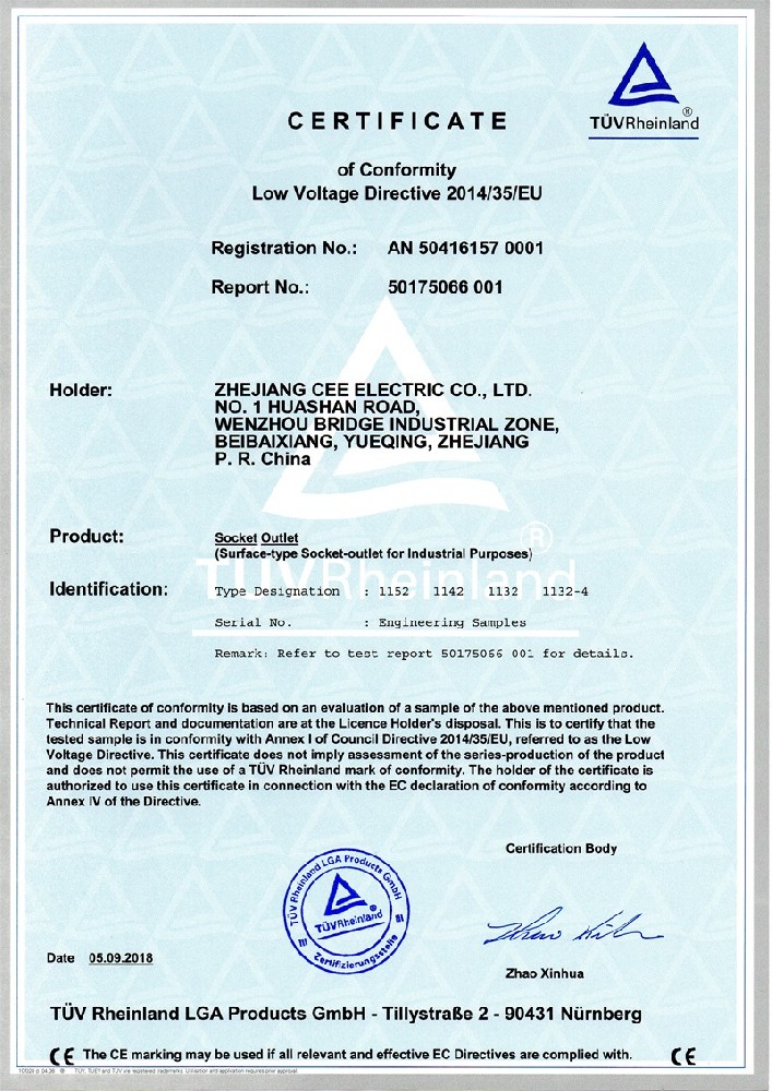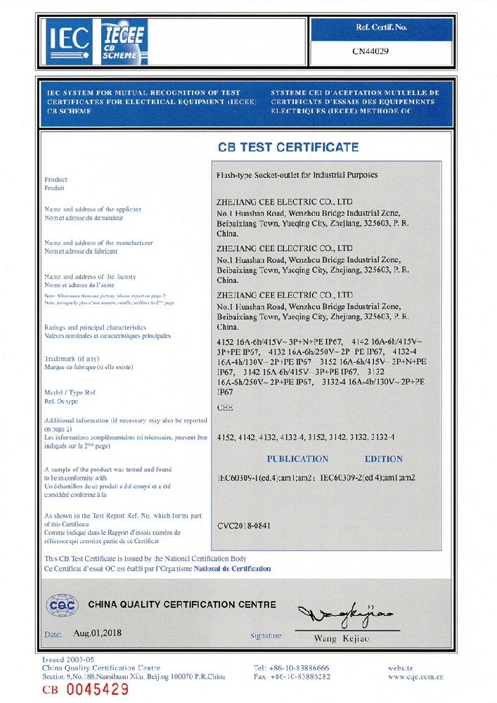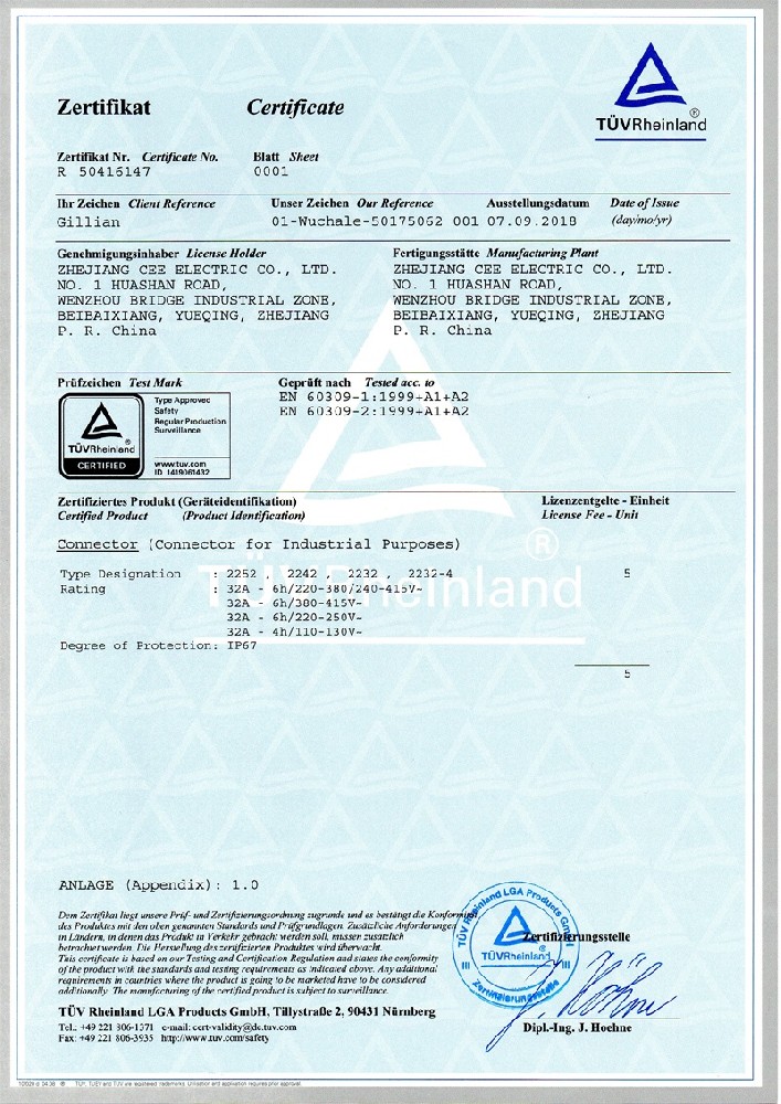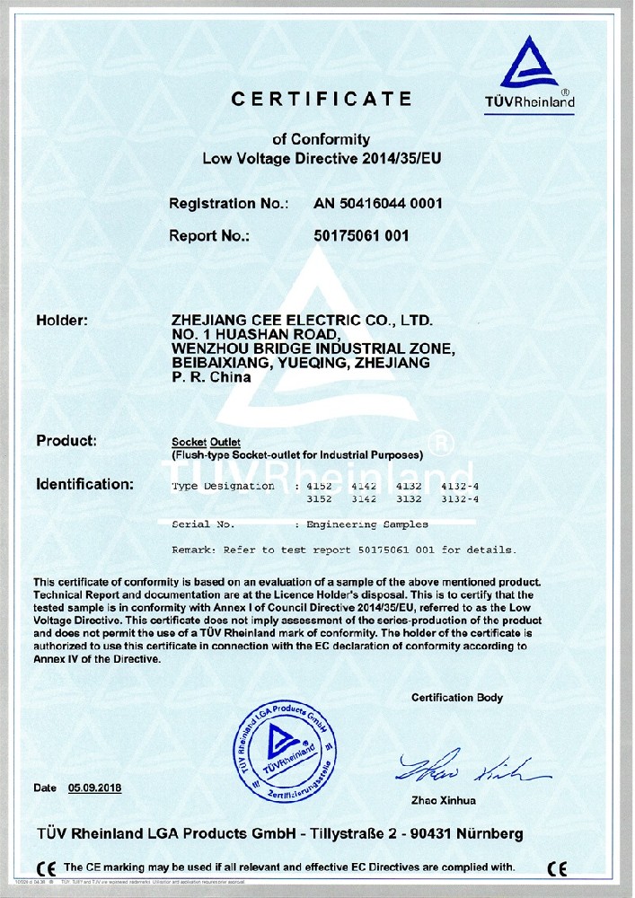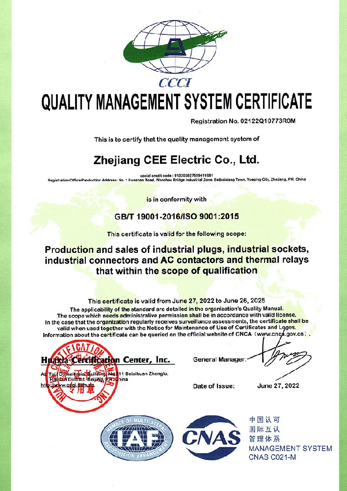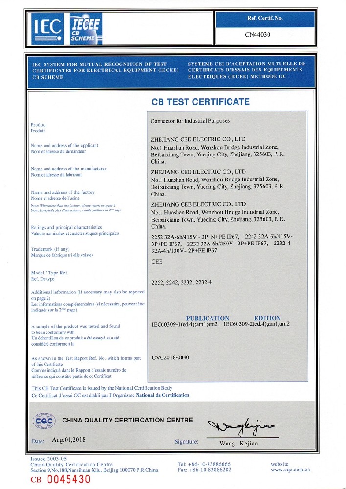 公司全面貫徹實(shí)施IS09001:2015質(zhì)量管理體系認(rèn)證。工業(yè)插頭插座符合IEC 603 09-1-2, EN 60 309-1-2國際標(biāo)準(zhǔn), 組合插座箱符合EN61439標(biāo)準(zhǔn),并通過Intertek & TUV Rheinland & CQC等認(rèn)證。證書包括TUV、SEMKO、CE、CB、EAC,并符合RoHS和Reach等適用法規(guī)。公司引進(jìn)先進(jìn)生產(chǎn)設(shè)備和精密檢測(cè)試驗(yàn)儀器、不斷引入高科技工藝流程和技術(shù)人才,為公司的產(chǎn)品研發(fā)、質(zhì)量升級(jí)、管理創(chuàng)新提供了強(qiáng)有力的保障。公司將持續(xù)以優(yōu)質(zhì)的產(chǎn)品和服務(wù),贏得客戶的最大滿意為宗旨,發(fā)揚(yáng)“創(chuàng)新、服務(wù)、溝通”的企業(yè)精神,力促CEE品牌從中國走向世界。我們牢牢把握時(shí)代賦予的使命和機(jī)遇,與海內(nèi)外合作伙伴共同開創(chuàng)事業(yè)的新高度。