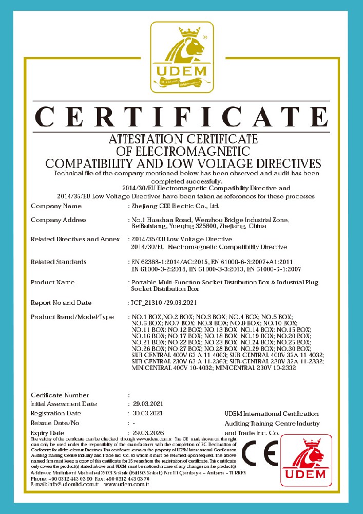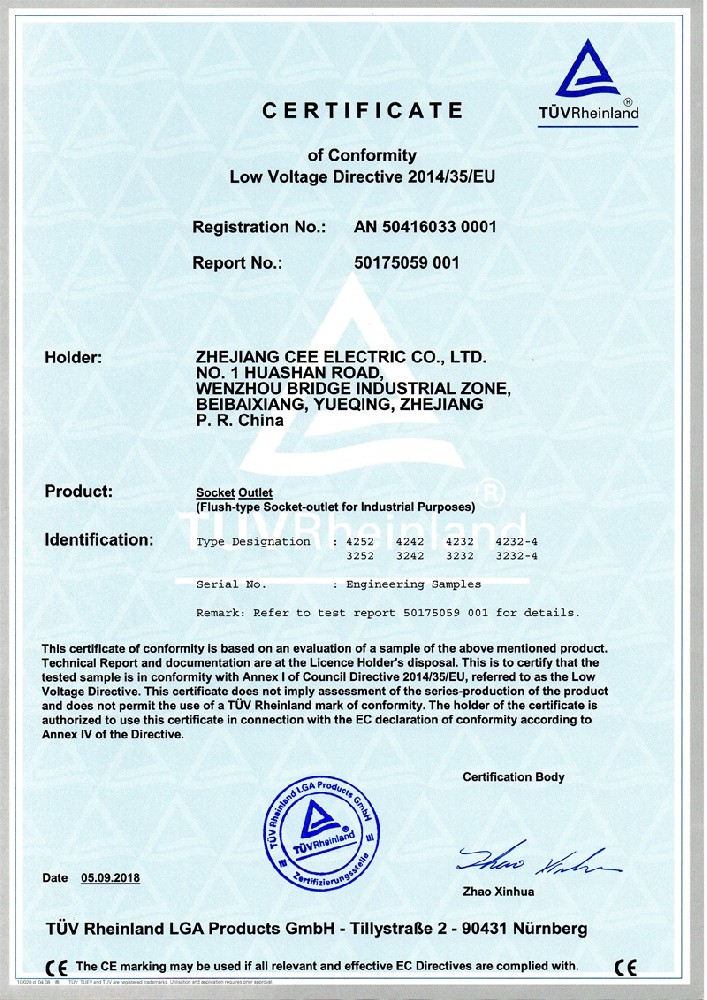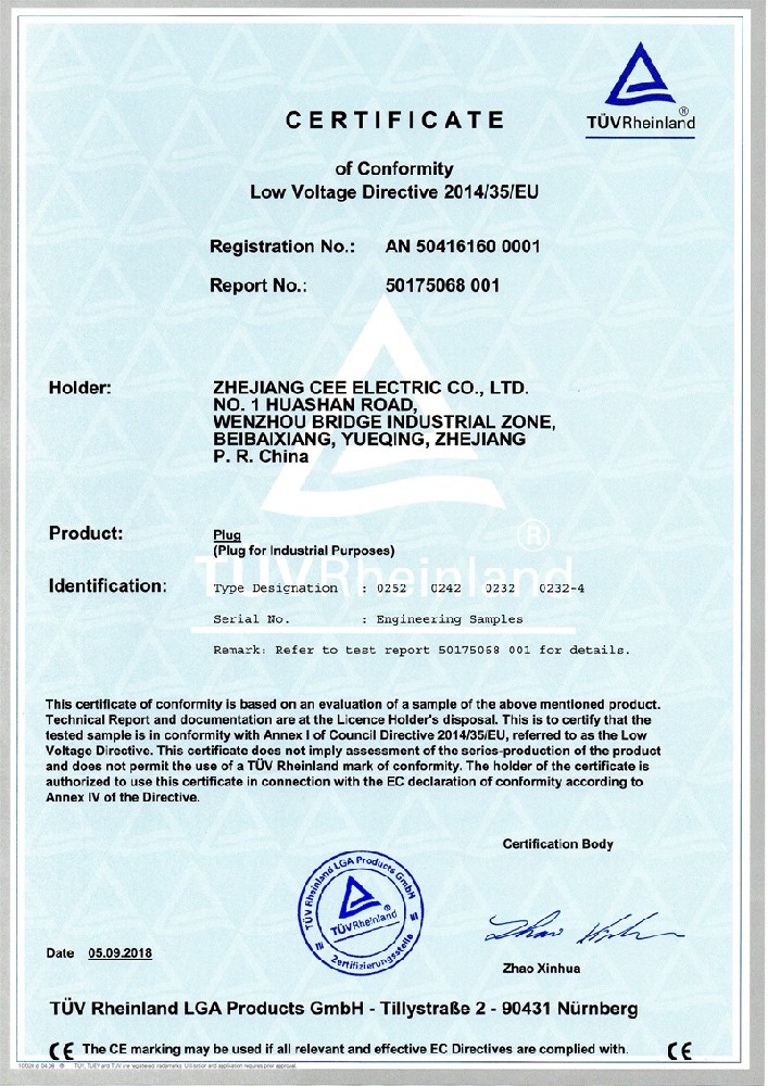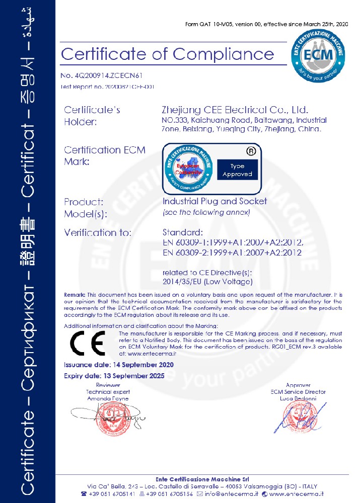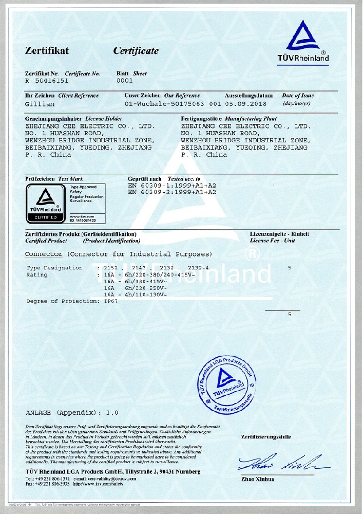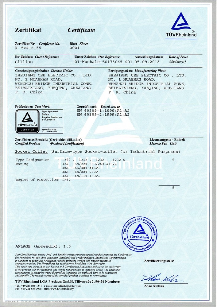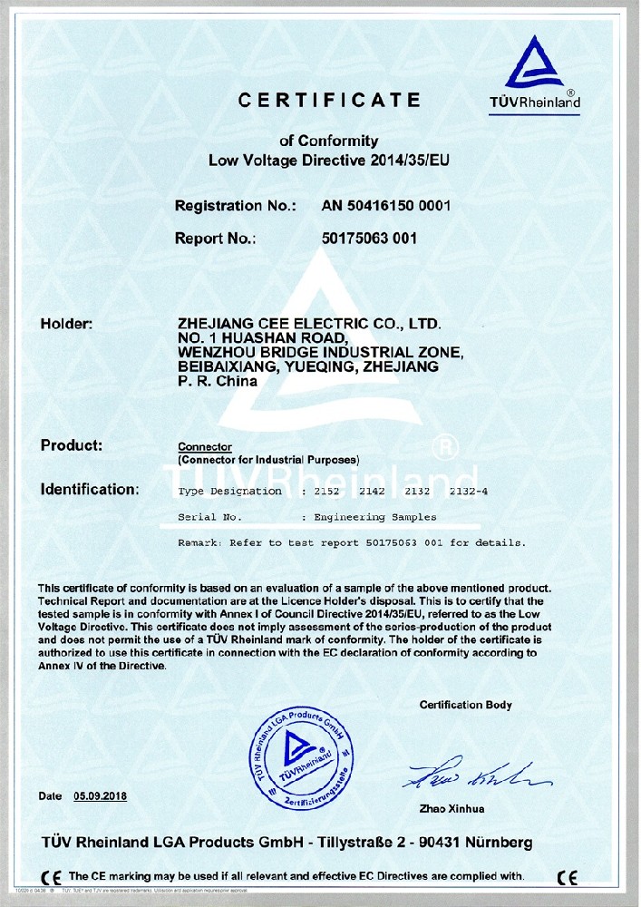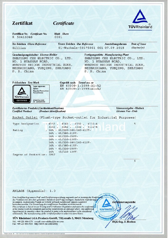 公司全面貫徹實(shí)施IS09001:2015質(zhì)量管理體系認(rèn)證。工業(yè)插頭插座符合IEC 603 09-1-2, EN 60 309-1-2國際標(biāo)準(zhǔn), 組合插座箱符合EN61439標(biāo)準(zhǔn),并通過Intertek & TUV Rheinland & CQC等認(rèn)證。證書包括TUV、SEMKO、CE、CB、EAC,并符合RoHS和Reach等適用法規(guī)。公司引進(jìn)先進(jìn)生產(chǎn)設(shè)備和精密檢測(cè)試驗(yàn)儀器、不斷引入高科技工藝流程和技術(shù)人才,為公司的產(chǎn)品研發(fā)、質(zhì)量升級(jí)、管理創(chuàng)新提供了強(qiáng)有力的保障。公司將持續(xù)以優(yōu)質(zhì)的產(chǎn)品和服務(wù),贏得客戶的最大滿意為宗旨,發(fā)揚(yáng)“創(chuàng)新、服務(wù)、溝通”的企業(yè)精神,力促CEE品牌從中國走向世界。我們牢牢把握時(shí)代賦予的使命和機(jī)遇,與海內(nèi)外合作伙伴共同開創(chuàng)事業(yè)的新高度。