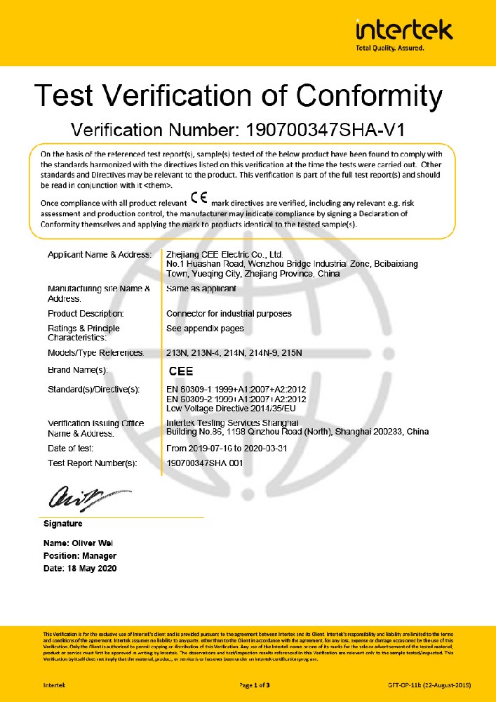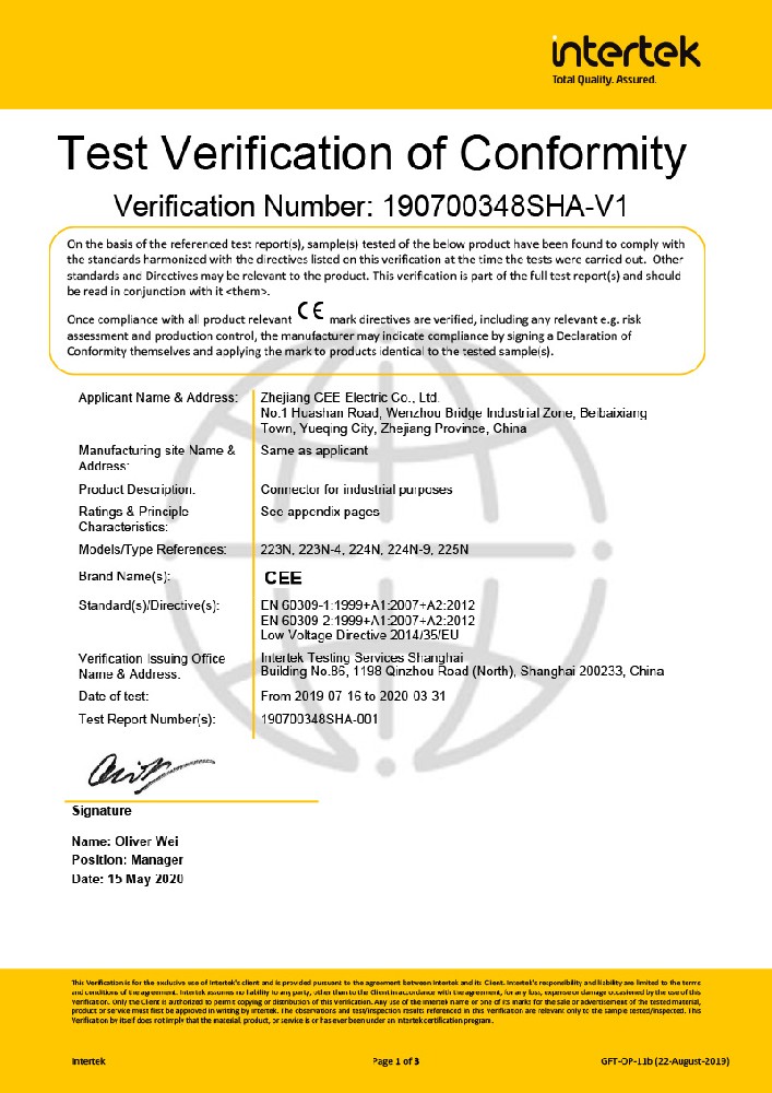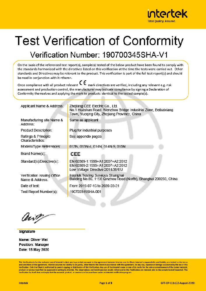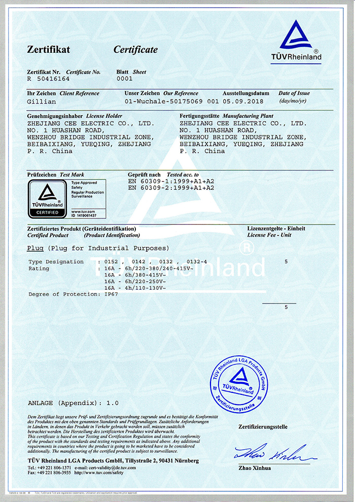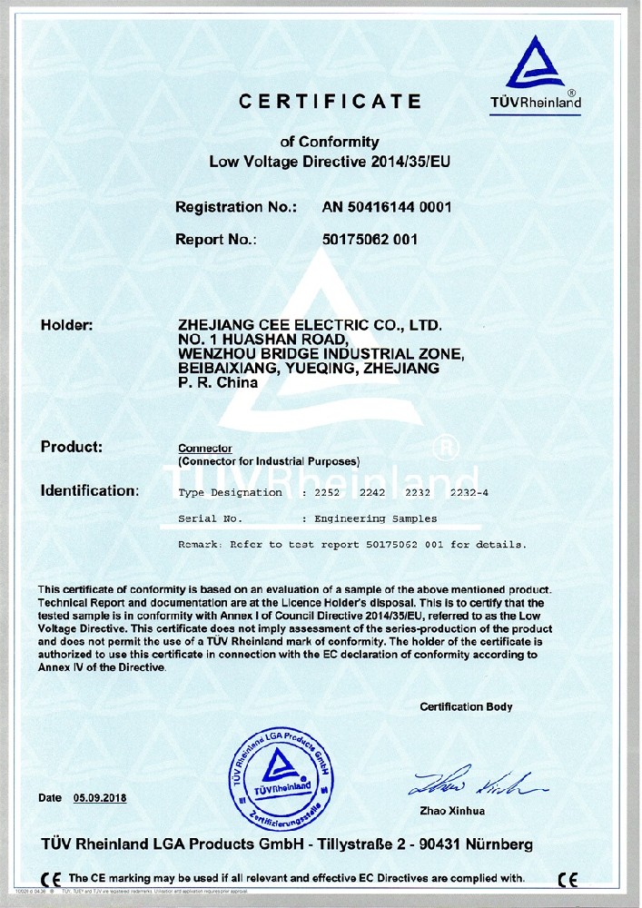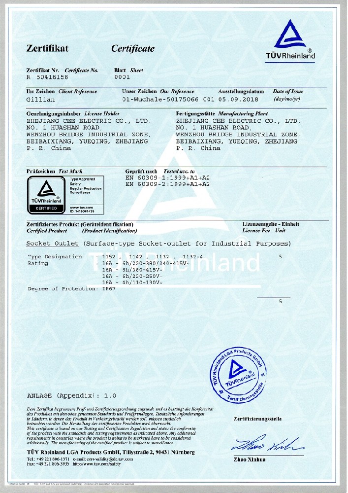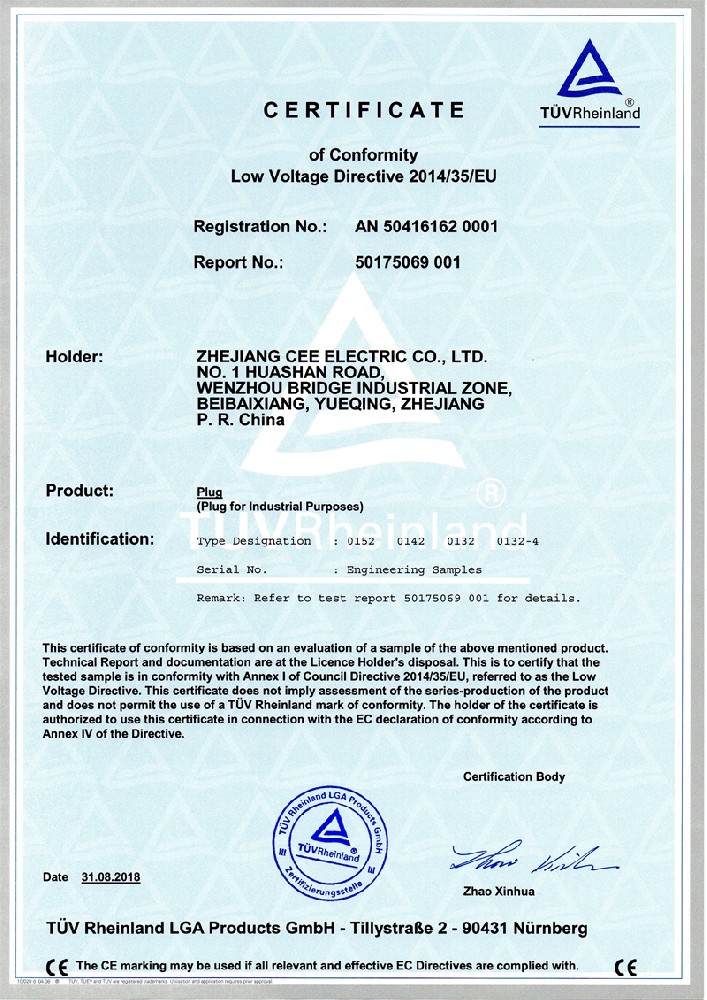 公司全面貫徹實(shí)施IS09001:2015質(zhì)量管理體系認(rèn)證。工業(yè)插頭插座符合IEC 603 09-1-2, EN 60 309-1-2國際標(biāo)準(zhǔn), 組合插座箱符合EN61439標(biāo)準(zhǔn),并通過Intertek & TUV Rheinland & CQC等認(rèn)證。證書包括TUV、SEMKO、CE、CB、EAC,并符合RoHS和Reach等適用法規(guī)。公司引進(jìn)先進(jìn)生產(chǎn)設(shè)備和精密檢測(cè)試驗(yàn)儀器、不斷引入高科技工藝流程和技術(shù)人才,為公司的產(chǎn)品研發(fā)、質(zhì)量升級(jí)、管理創(chuàng)新提供了強(qiáng)有力的保障。公司將持續(xù)以優(yōu)質(zhì)的產(chǎn)品和服務(wù),贏得客戶的最大滿意為宗旨,發(fā)揚(yáng)“創(chuàng)新、服務(wù)、溝通”的企業(yè)精神,力促CEE品牌從中國走向世界。我們牢牢把握時(shí)代賦予的使命和機(jī)遇,與海內(nèi)外合作伙伴共同開創(chuàng)事業(yè)的新高度。